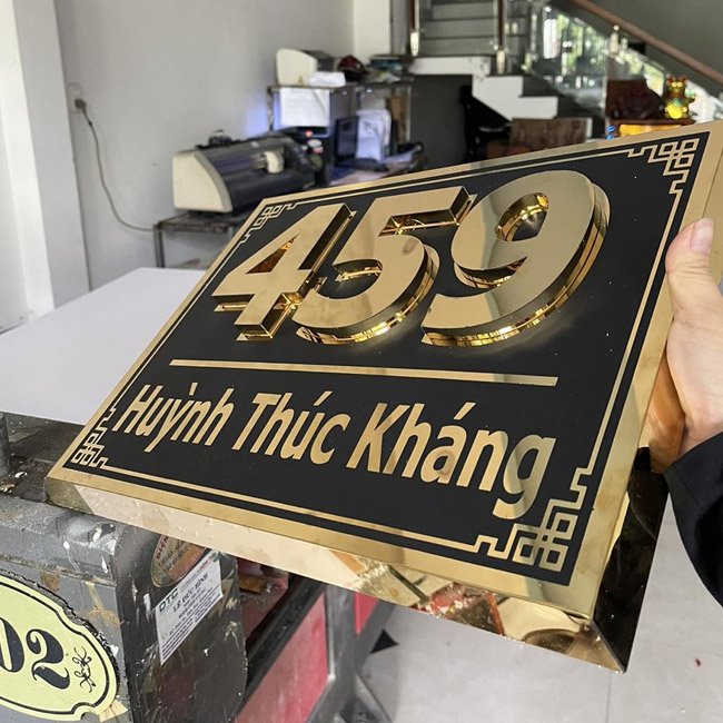 Biển số nhà inox nền đen, chữ vàng bóng