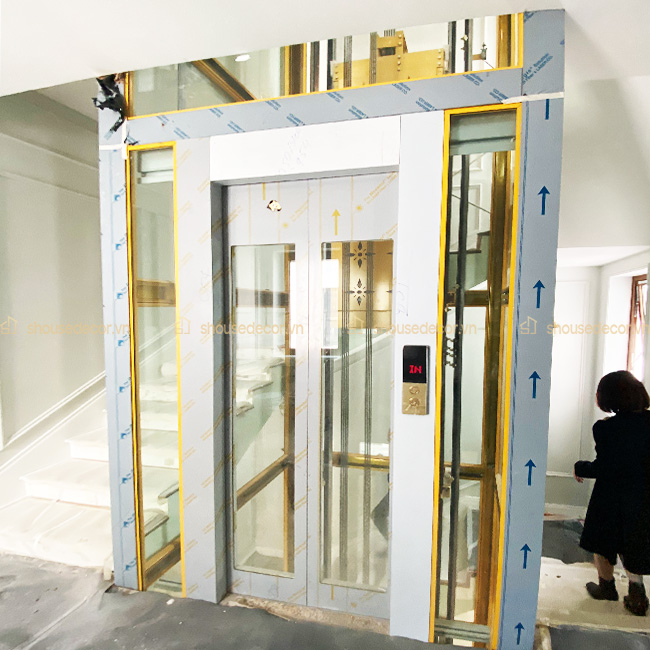 Sau quá trình trao đổi, gia chủ quyết định lựa chọn toàn bộ phần khung thép thang máy được ốp inox vàng gương 304 chất lượng cao với độ dày 0,8 - 1mm.