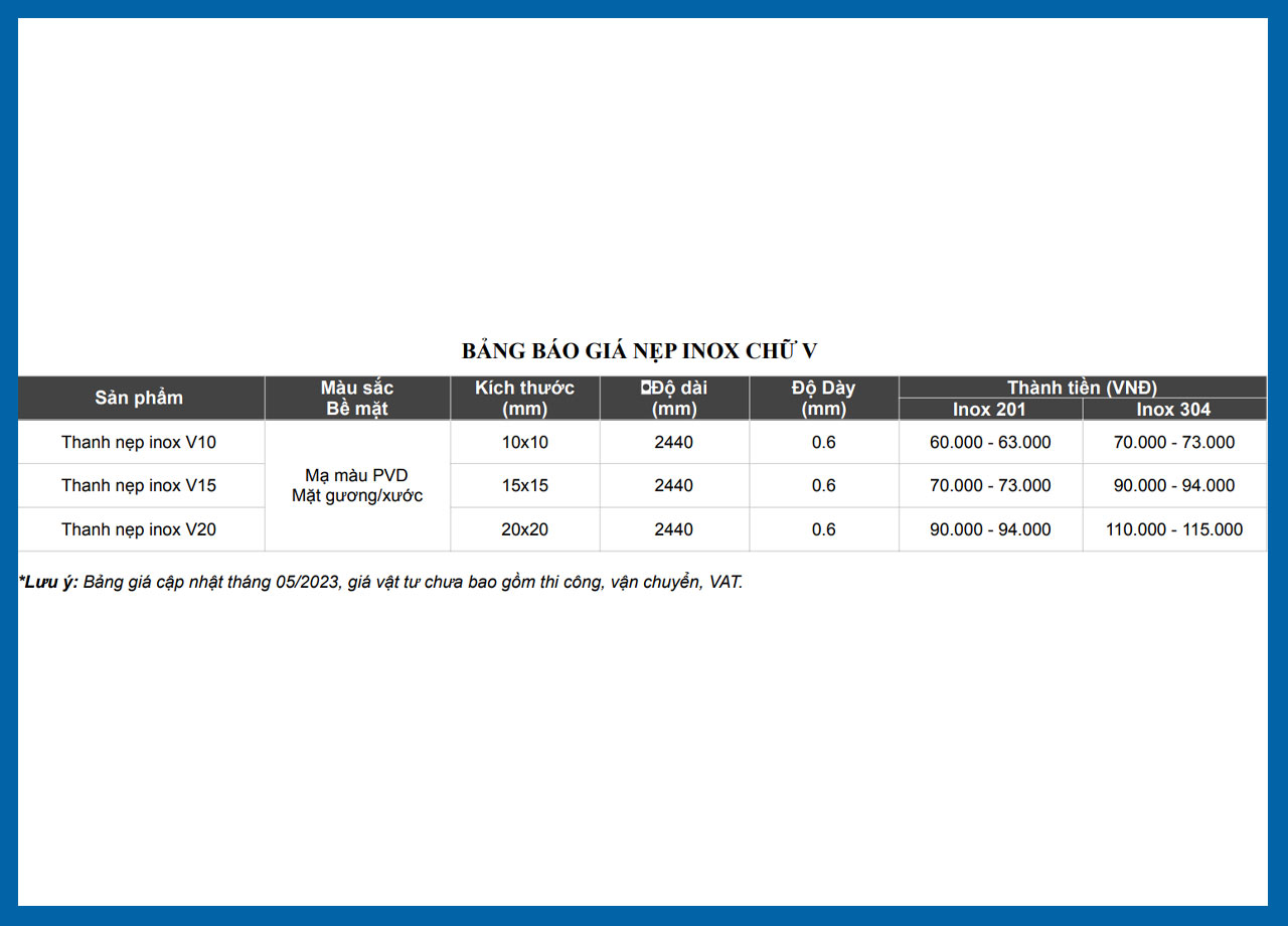 4. Bảng giá thi công nẹp inox chữ V xước mới nhất