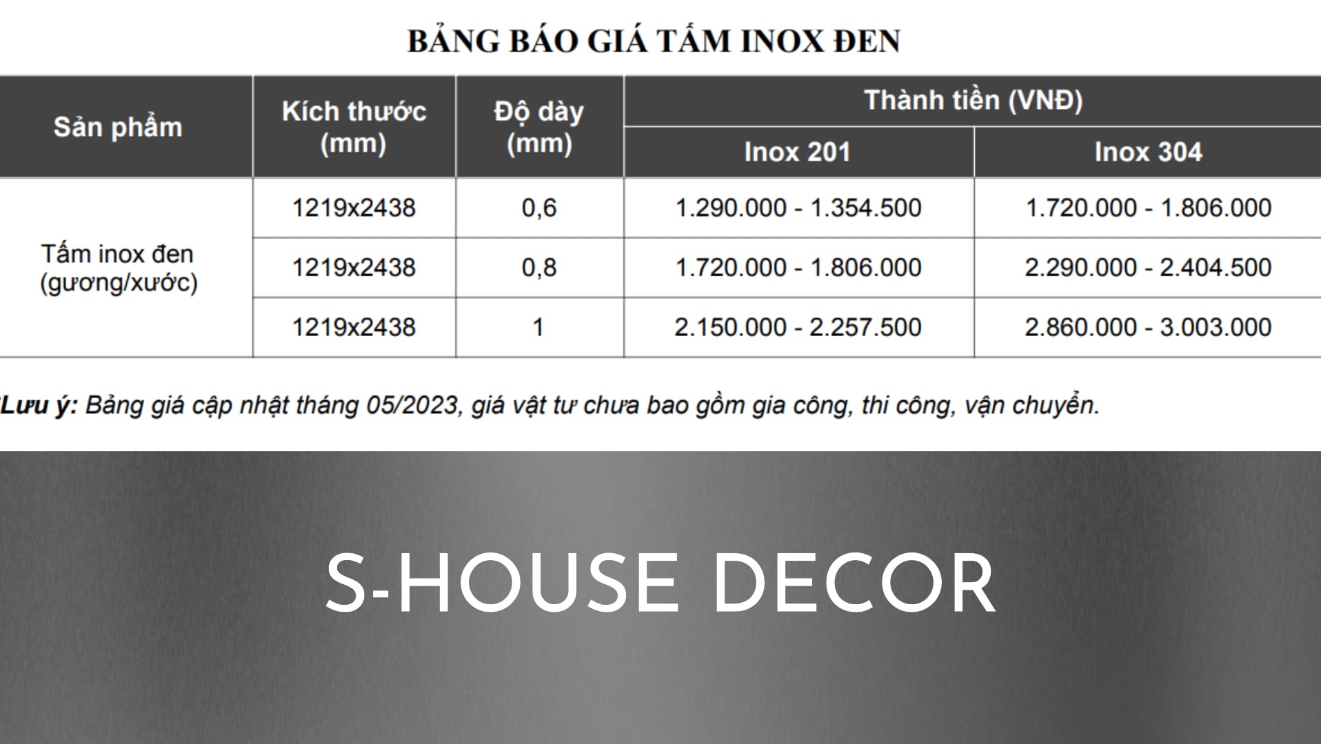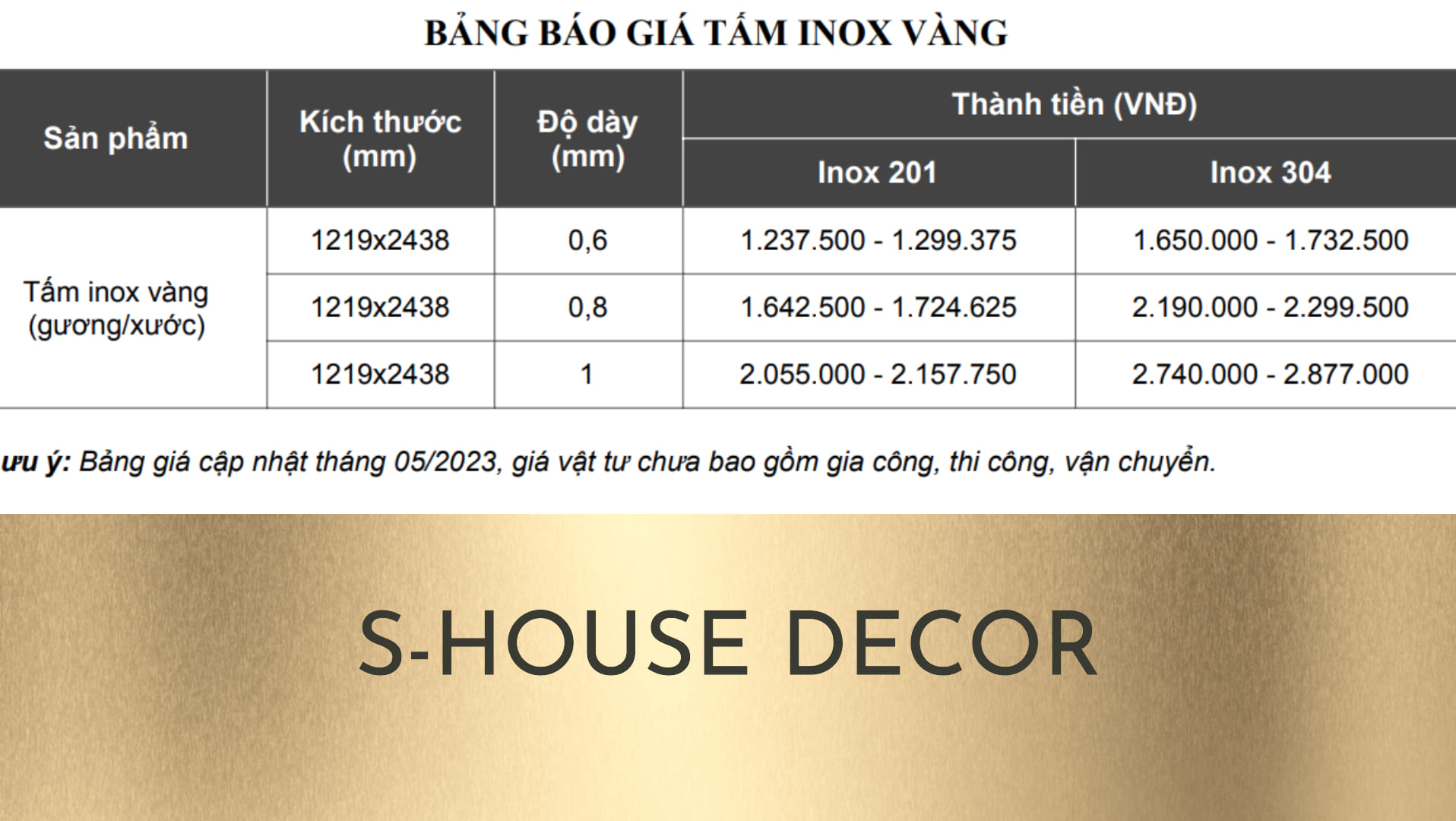 Đây là bảng giá tấm inox bóng gương được cập nhật mới nhất của S-House Decor, một trong những đơn vị chuyên cung cấp và thi công inox bóng gương uy tín, chất lượng và giá cả hợp lý tại Hà Nội và các tỉnh thành khác.