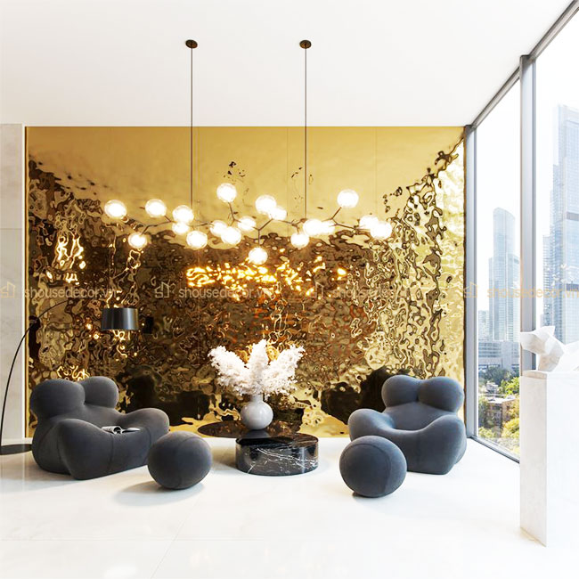1. Sử dụng tấm sóng inox 3D thiết kế trang trí phòng khách