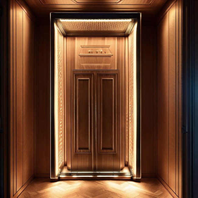 Thang máy gia đình 200kg có thiết kế cổ điển và lịch lãm với vỏ gỗ tự nhiên và đèn led trang trí.