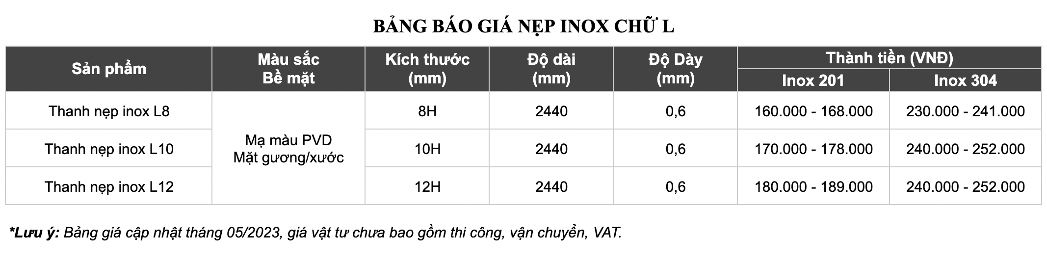 Báo giá nẹp inox chữ L-8mm S-House Decor mới nhất