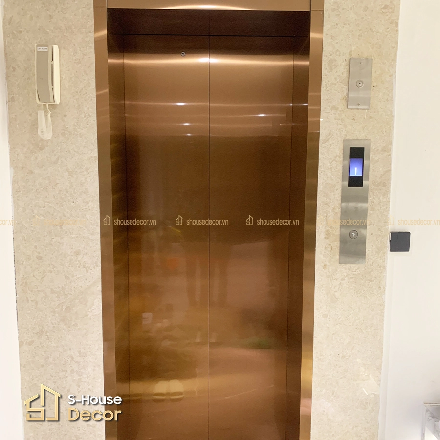[Trang trí thang máy bằng inox xước đồng khung bao bản rộng hoàn thiện sang trọng]