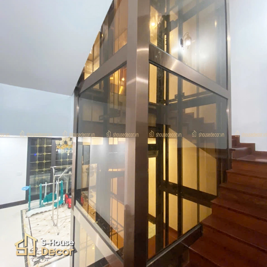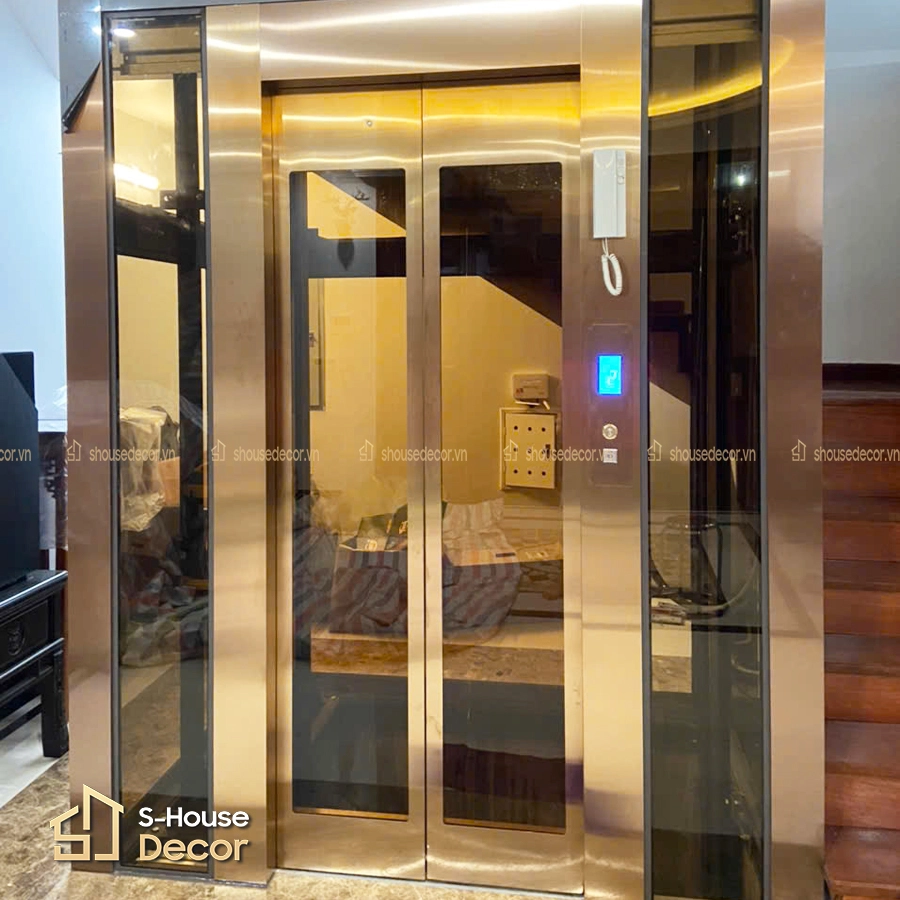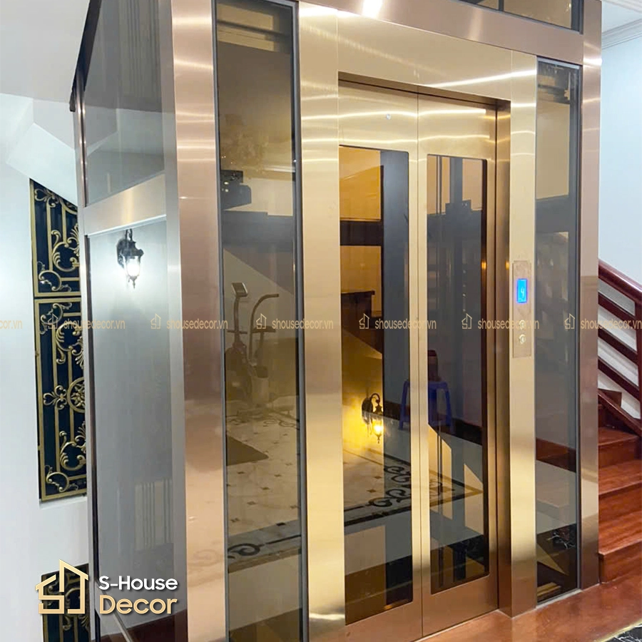 [Trang trí thang máy gia đình với khung thép inox xước đồng hiện đại]