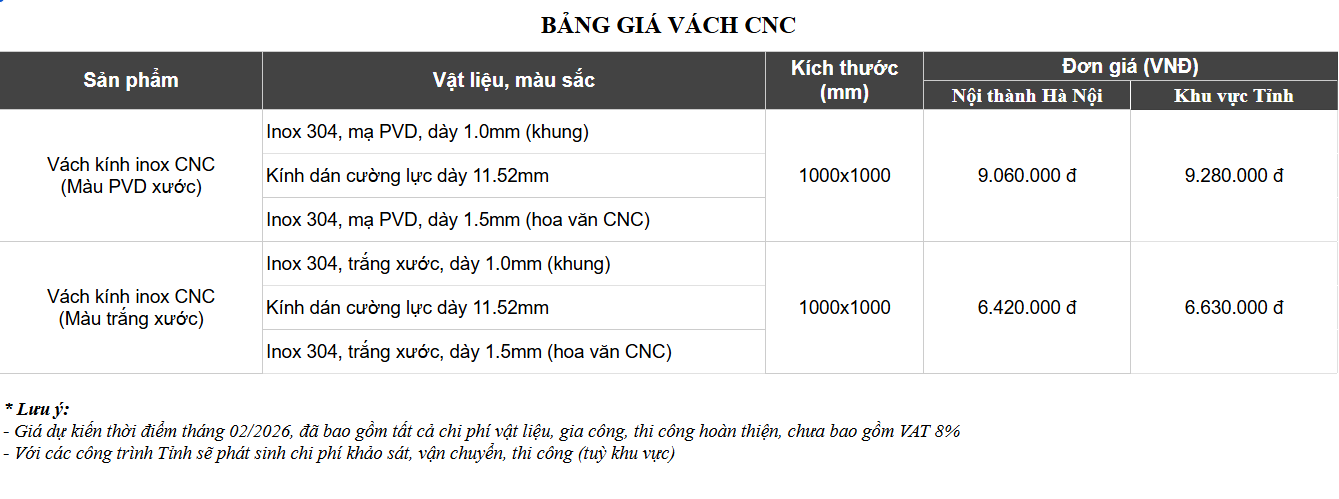 Tùy theo kiểu dáng vách, độ dày inox, hoa văn CNC và phương án lắp đặt, chi phí thi công vách inox kính sẽ có sự khác biệt. Để hoàn thiện phương án thi công phù hợp ngân sách, dưới đây là bảng báo giá chi tiết để khách hàng tiện tham khảo:
