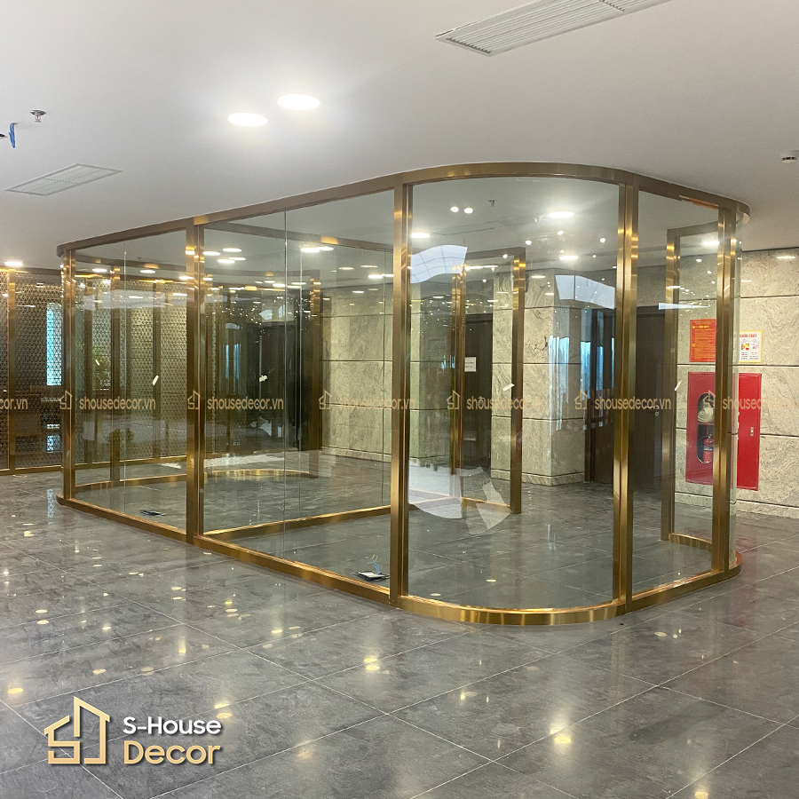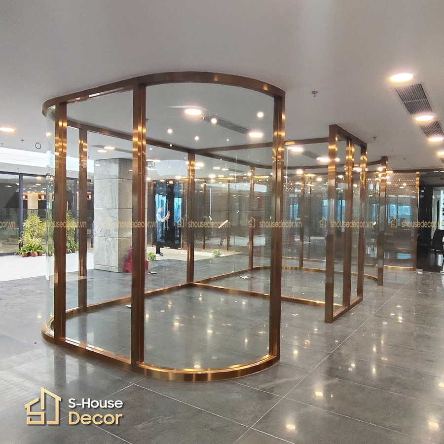 Vách inox 304 xước đồng khung cong kết hợp kính hiện đại